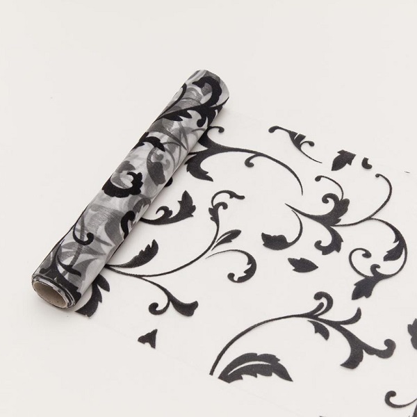 23,5 cm széles inda mintás organza futó (5 m) - fehér és fekete