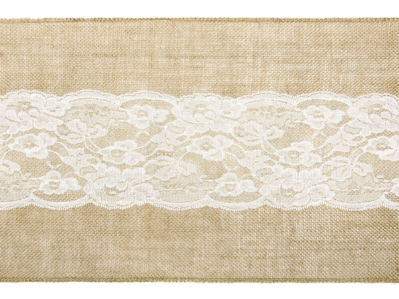 Zsákvászon (juta) asztali futó, csipke középpel, vintage vagy rusztikus stílusú dekorációhoz. |