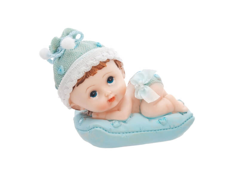 Párnán fekvő fiúbaba tortadísz, világoskék kiegészítőkkel. Babaváró bulira, keresztelő ünnepségre, első szülinapra – a torta tetejére vagy akár ajándéknak. |
