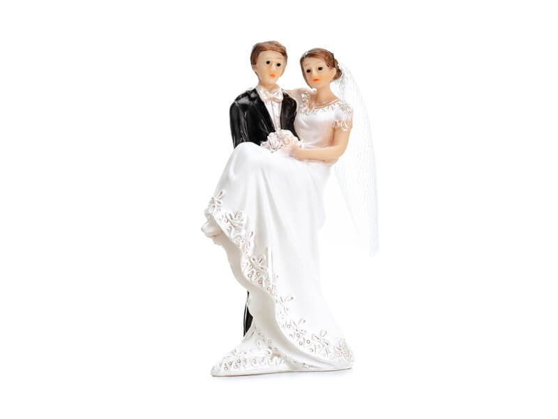 Esküvői tortadísz, a menyasszonyt ölbe kapó vőlegénnyel. |