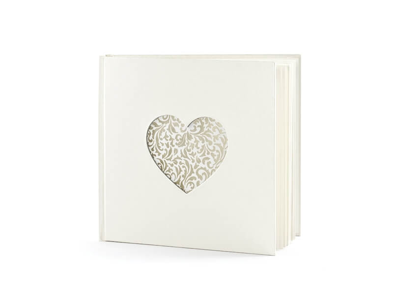 Elegáns vendégkönyv esküvőre, krém gyöngyház borítóval, lézervágott szív díszítéssel. 60 lapot (120 üres oldalt) tartalmaz.