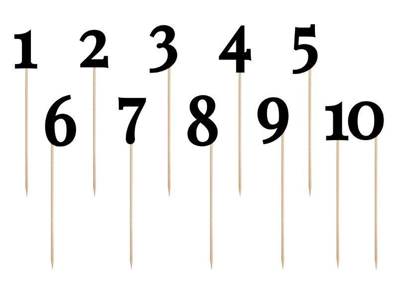 Fekete asztalszámok, fa pálcikán. 0 és 9 közötti számokkal (1-től 10-ig számozhatók velük az asztalok).