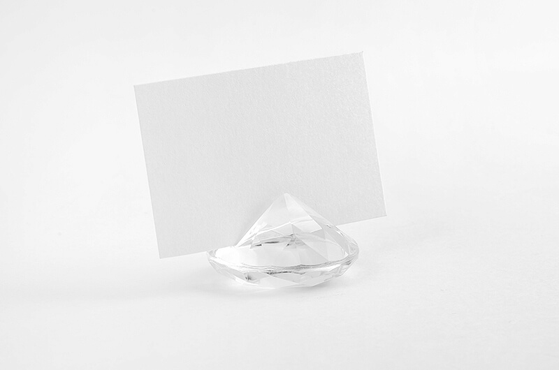 Gyönyörű gyémánt alakú, áttetsző ültetőkártya tartó, amely nemcsak dekorációs elem, hanem köszönetajándék is lehet a vendégeknek (fényképtartónak is használható). |