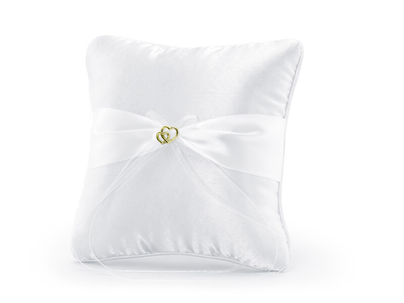 Fehér színű gyűrűpárna, szatén szalaggal és arany szívekkel. |