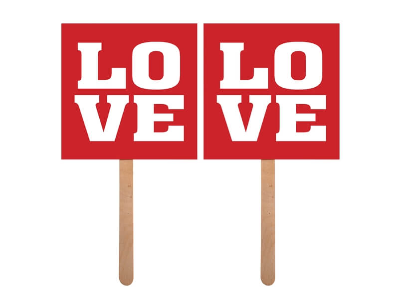 LOVE feliratú táblák, 9 x 9 cm-es kartok lapokból, fa pálcikán. A csomag 2 db kis táblácskát tartalmaz. Vidám kiegészítője lehet az esküvői fotózásnak vagy a Valentin napi dekorációnak.