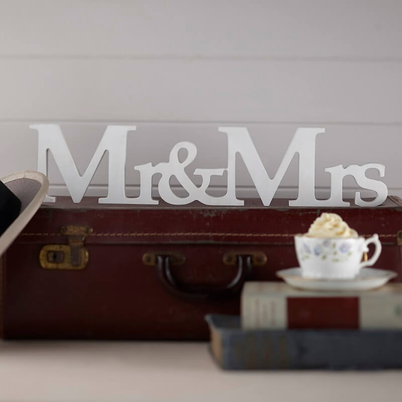 Mr és Mrs fa asztali dekoráció, fehér betűkkel. |