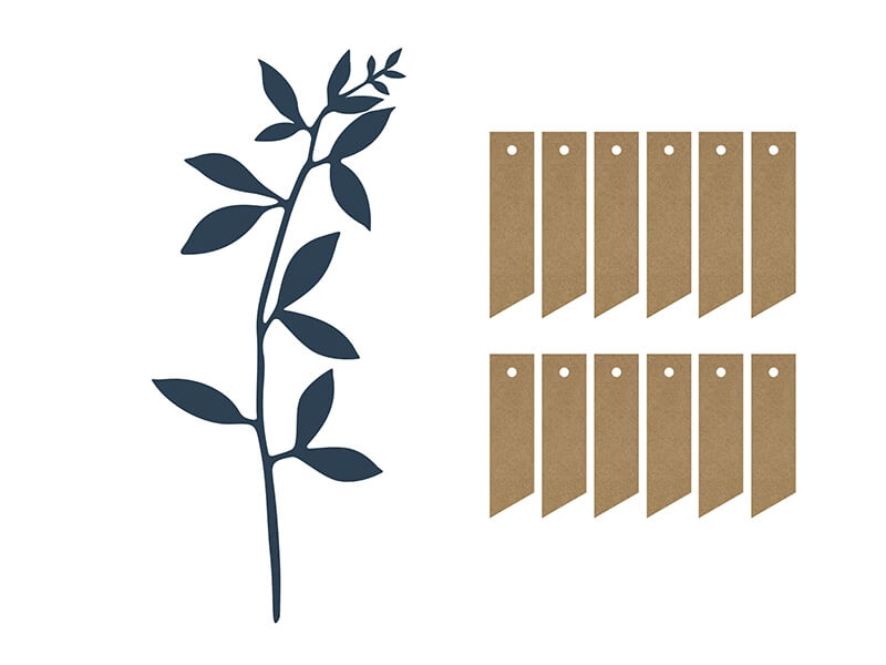 | Papír ág levelekkel, kis karton címkékkel. A csomag 6 db levelet (6,5x17,5 cm), 12 címkét (1,5x5,5 cm – 6 db, 1,5x6 cm – 6 db) és zsinórt (kb. 6 méter) tartalmaz. | |