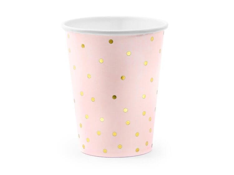 Rózsaszín papír pohár arany pöttyökkel, 6 darabos csomagolásban.