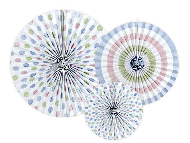 Pasztell színű papír rozetta. Egy csomagban 3 db különböző méretű rozetta található: 40 cm, 32 cm és 23 cm átmérőjű.