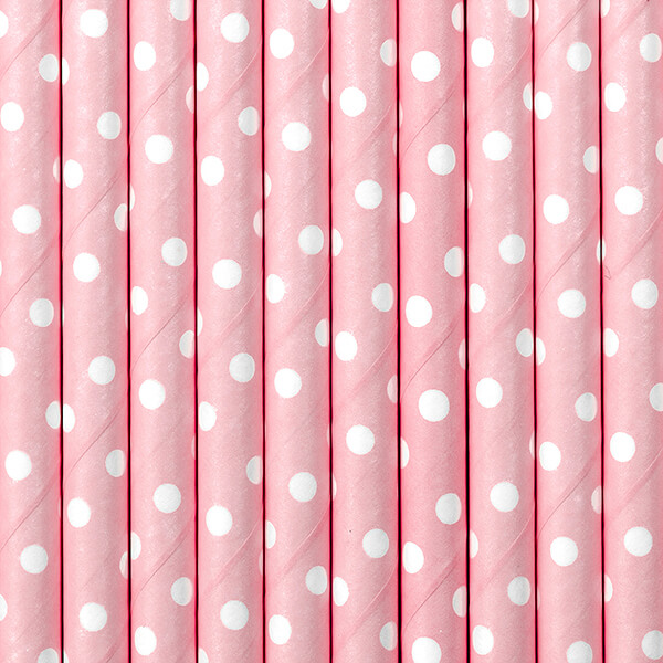 Rózsaszín alapon fehér pöttyös papír szívószál, 10 darabos csomagolásban.