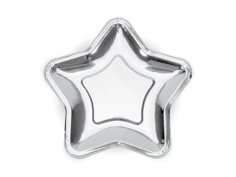 Ezüst színű, csillag alakú papír tányér, 6 darabos csomagolásban.