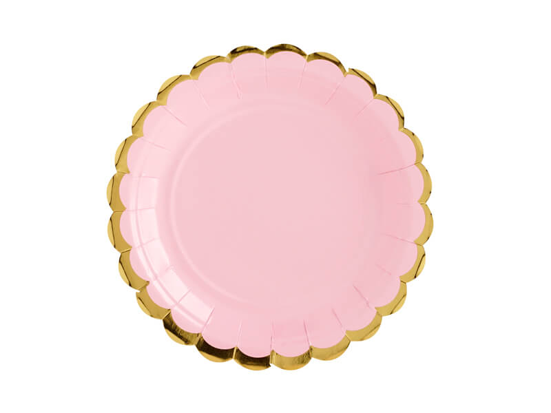 Rózsaszín papír tányér arany szegéllyel, 6 darabos csomagolásban.