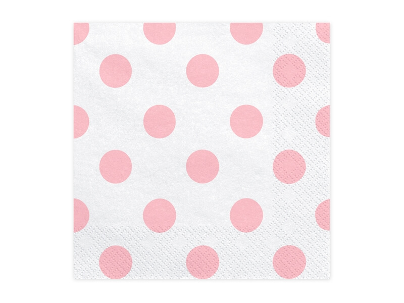 Rózsaszín alapon fehér pöttyös, 3 rétegű szalvéta.