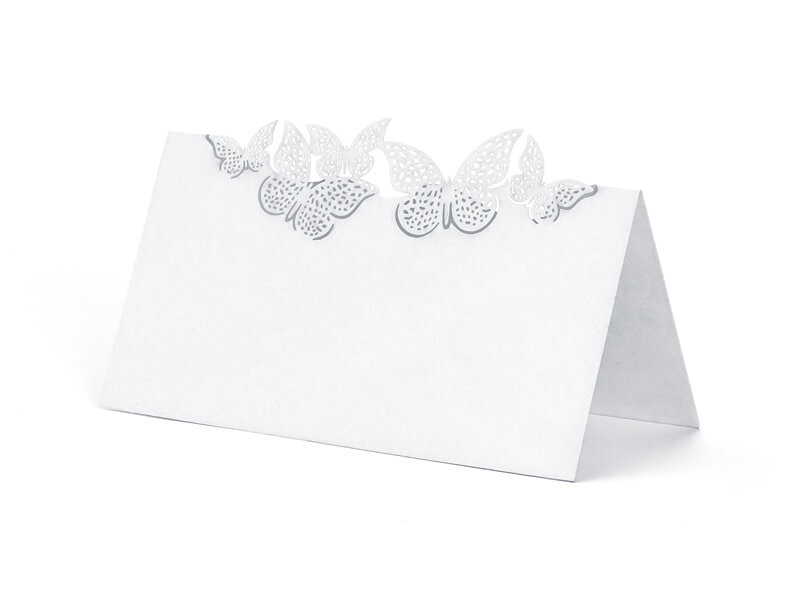 | Elegáns esküvői ültetőkártya, gyöngyházfényű papírból, pillangós díszítéssel. | |