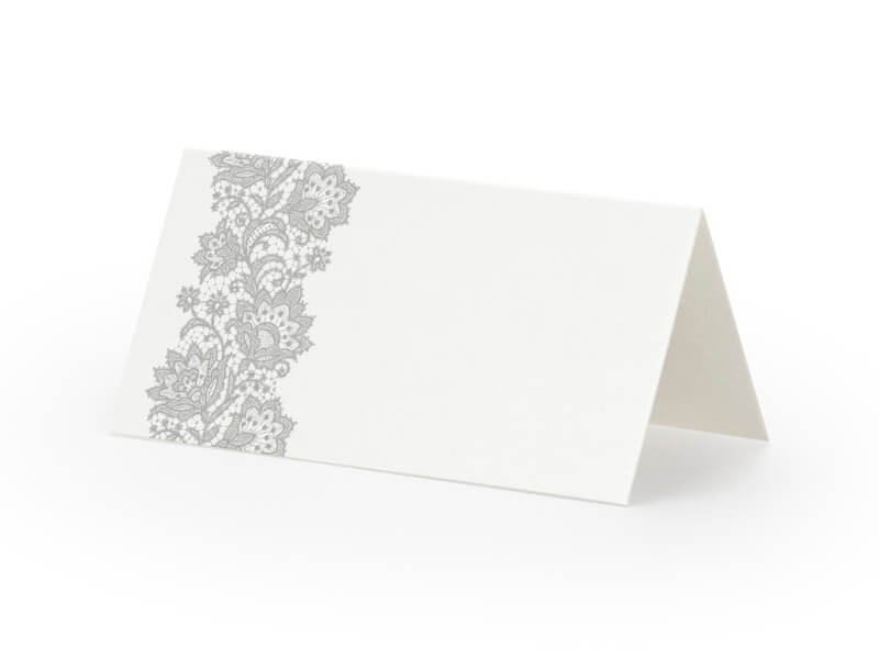 Elegáns esküvői ültetőkártya, ezüst díszítéssel. |